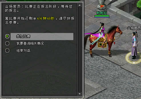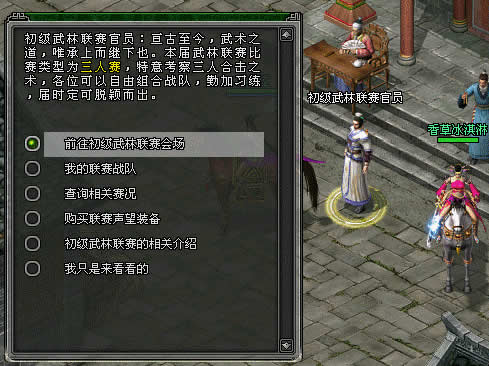 ·比赛开始时,战队选手可以从各大城市的初级武林联赛官员处,进入相应的会场。