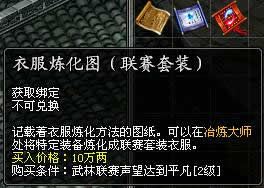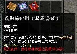 玩家可以根据自己的联赛声望,在各大城市联赛官员处购买特定的极品装备炼化图。物品展示: