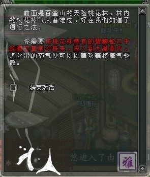 蛊王生命至三分之一时会向蛊神求助。蛊神带有梦蝶技能,帮主蛊王回血。先重点攻击蛊神,将他杀死,在打败蛊王即任务完成。新副本流程比较复杂,不像伏牛山那样单一。NPC都设计了对话,趣味性很高。
