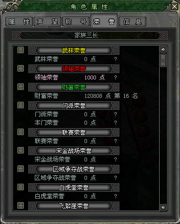 打开排行榜系统的界面,就可以看到“武林荣誉”、“领袖荣誉”、“财富荣誉”三个按钮,可分别查询这三个荣誉系统。