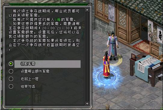 争夺战开启宣战期,各帮前往领土官员处确定宣战目标,争夺战战斗开启。