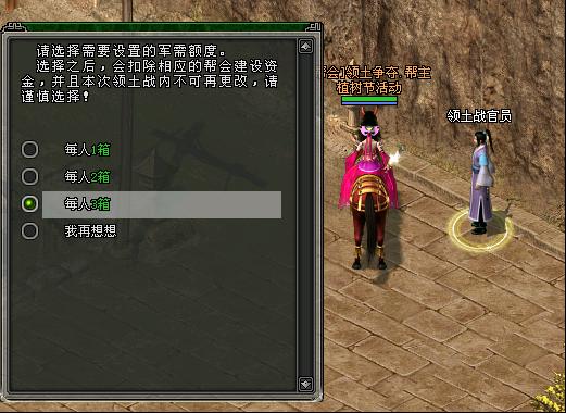 帮主可以在“设置帮会额外军需”中选择让帮会成员领取更多箱的军需,但每增加1箱,需要消耗一定的帮会建设资金。