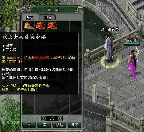 帮会商店有出售变身道具及召唤道具,在争夺战中合理的使用这些道具,将给你带来意想不到的效果,购买道具首先需要和“领土战官员”对话,选择帮会商店,进入商店后就可以直接购买你需要的道具了。