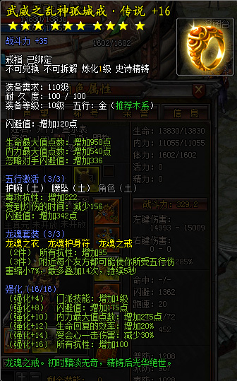 卓越/史诗/传说的龙魂装备,可使用联赛声望/武林大会声望/祈福声望商店购买的【精铸石】进行精铸(只有声望达到购买原卓越和史诗装备的等级才可购买对应的精铸石),对装备属性进行提升。除继承装备的特殊属性(如天元心法、门派技能+1等)外,还可大幅提升其明暗属性和强化属性。