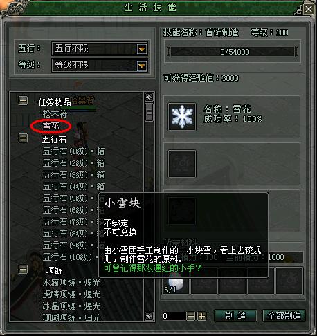 采集到“小雪团”后,将其用加工系生活技能加工出“小雪块”,再用制造系生活技能制作出“雪花”。